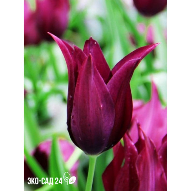 Тюльпан Бургунди выведен селекционерами совсем недавно, он принадлежит к лилиецветным сортам (класс L). Цветет лилиецветный тюльпан этого сорта в мае, образуя шикарный высокий бокал с остроконечными отогнутыми наружу лепестками, высота бокала до 8-10 см. Бутон тюльпана Burgundy очень темного фиолетового цвета с пурпурным оттенком, при роспуске напоминает темно-красную звезду. Продолжительность цветения: до 2-3 недель. Обладает тюльпан Бургунди средней скоростью роста, подходит как для озеленения и украшения клумб, так и для букетов, отлично растет на хорошо освещенном месте и в полутени. Красивый цветок лилиецветного тюльпана возвышается на прочной ноге, высотой до 60 см.